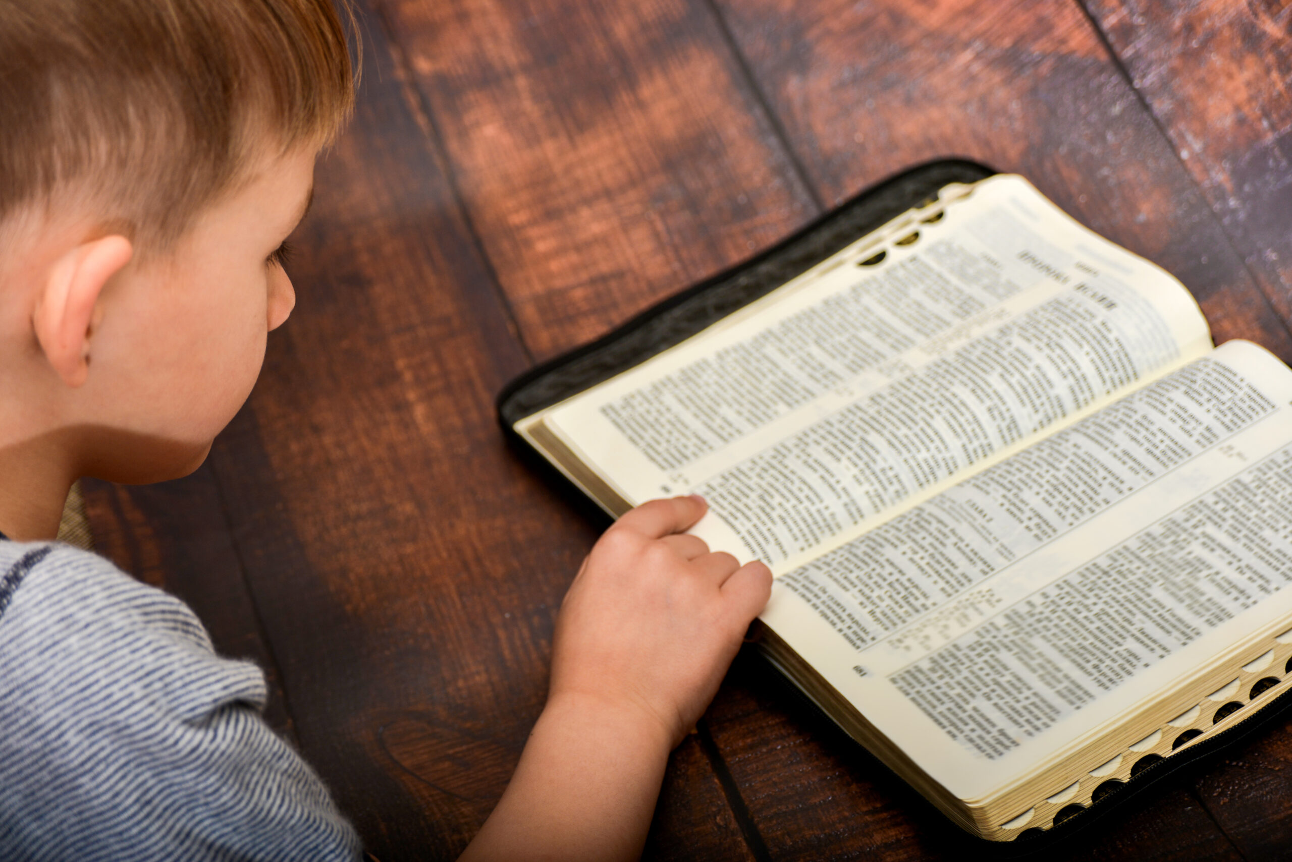 The boy reads the Bible and prays, worshiping the child in spirit and truth.