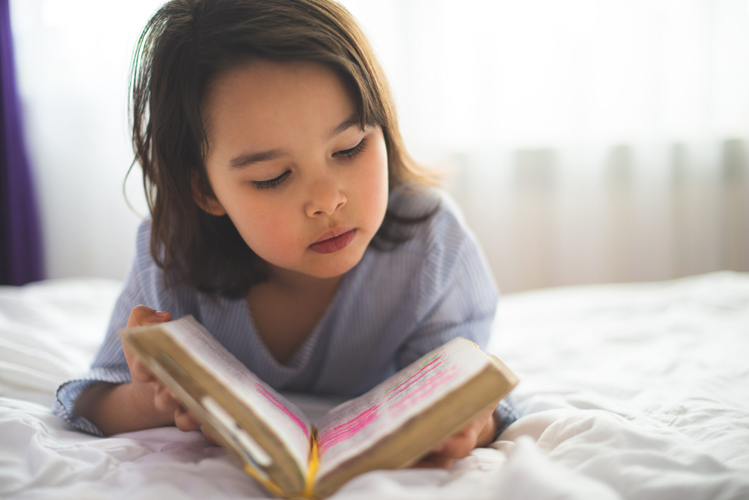 Little girl reading from bible while she is in bed in the mornin